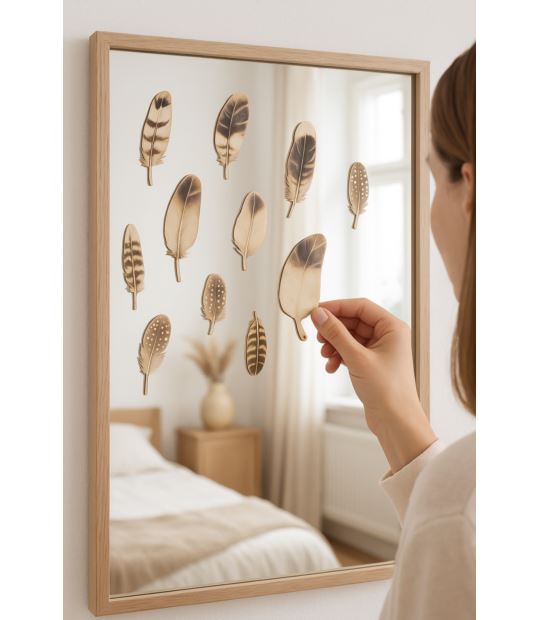 Na odwrocie każdego piórka znajduje się małe kółeczko z taśmy dwustronnej. Wystarczy odkleić zabezpieczenie i przykleić piórko tam, gdzie chcesz – na ścianę, lustro, drzwi szafy, ramę zdjęcia albo planner vision board nad biurkiem. Nie potrzebujesz gwoździ ani wiercenia.