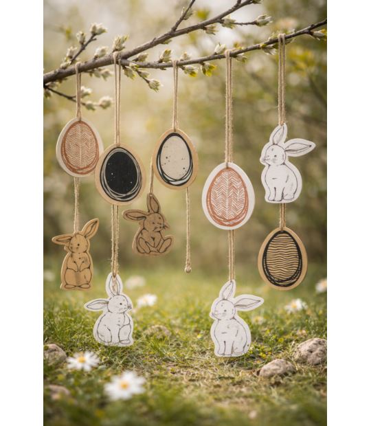 Płaska zawieszka w kształcie jajka lub zająca wykonana z płyty MDF na jutowym sznureczku, w naturalnych kolorach, z namalowanycm wzorkiem. Oryginalna dekoracja wielkanocna do zawieszenia na wiosennej gałązce.