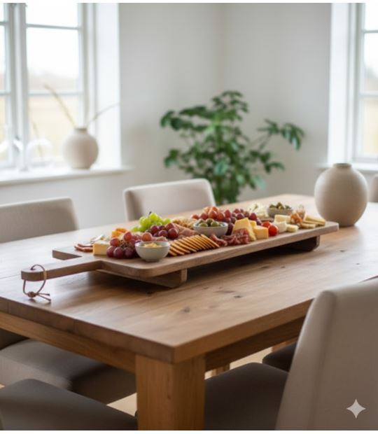 Ta wyjątkowo długa, 100-centymetrowa deska do serwowania, wykonana z solidnego, egzotycznego drewna mango w naturalnym odcieniu, to elegancki i funkcjonalny element, który stanie się centralnym punktem na każdym dużym stole. Deska posiada delikatne nogi/płozy, które unoszą ją nad poziom stołu, co nie tylko dodaje elegancji, ale również eksponuje serwowane potrawy w niezwykle atrakcyjny sposób.