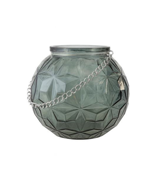 Stylowy lampion wykonany z grubego, tłoczonego szkła w odcieniu przydymionej zieleni zmieszanej z turkusem to dekoracja, która łączy w sobie elegancję i funkcjonalność. Geometryczny wzór na powierzchni pięknie odbija światło, tworząc wyjątkowy efekt zarówno w dzień, jak i po zmroku. Dzięki solidnemu metalowemu łańcuszkowi lampion można wygodnie przenosić lub zawiesić, co daje wiele możliwości aranżacyjnych – od stołu w jadalni, przez taras, aż po ogród.