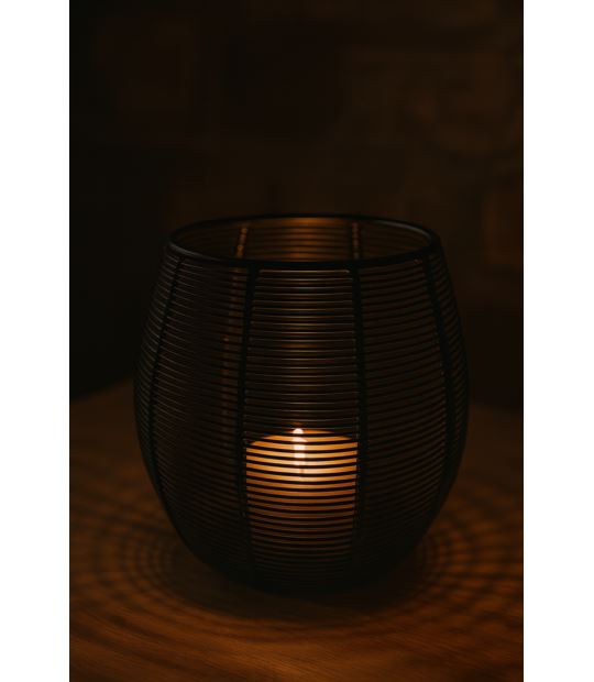 Ażurowy lampion wykonany z cienkich, czarnych drucików, które subtelnie przepuszczają światło świecy. Zapalony tworzy nastrojowy klimat i piękne, dekoracyjne refleksy w otoczeniu. Idealny jako dodatek do wnętrz w stylu nowoczesnym, loftowym czy boho.