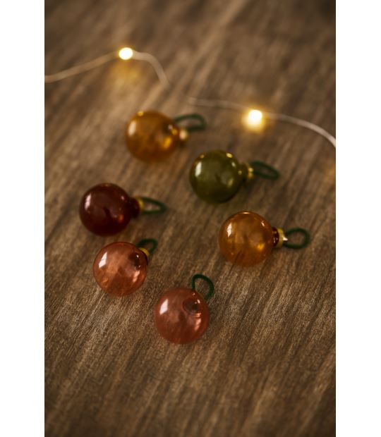 Zestaw sześciu małych, transparentnych bombek w ciepłej kolorystyce to subtelna i elegancka dekoracja, która doda blasku Twoim świątecznym aranżacjom. Bombki zachwycają delikatnymi odcieniami bursztynu, oliwki, różu i czerwieni – ich transparentna powierzchnia pięknie odbija światło, tworząc przytulny, nastrojowy efekt.