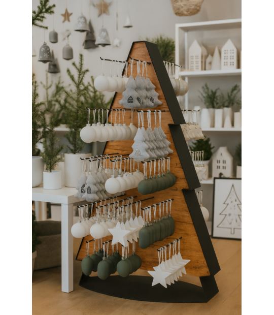 Przedstawiamy praktyczne i stylowe rozwiązanie do prezentacji bombek bożonarodzeniowych oraz innych zawieszek świątecznych. Ta choinka ekspozycyjna to idealny wybór dla sklepów, kwiaciarni czy stoisk świątecznych, które chcą przyciągnąć uwagę klientów elegancką i funkcjonalną aranżacją.