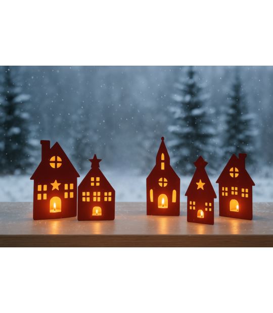 Ten uroczy metalowy świecznik na świeczkę typu tealight jest dostępny w sześciu różnych wariantach, z których każdy przypomina fasadę domku lub budowli. Wycięcia w kształcie okienek, drzwi, a czasem także gwiazdek, pozwalają światłu świecy delikatnie prześwitywać, tworząc nastrojowe refleksy i wprowadzając przytulną atmosferę. Intensywny czerwony kolor i minimalistyczny design czynią ten świecznik idealnym dodatkiem do świątecznych dekoracji.