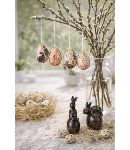 Zestaw czterech dekoracyjnych jajek wielkanocnych, które w prosty sposób wprowadzą do wnętrza wiosenny, świąteczny klimat. Każde jajko posiada cienki sznureczek, dzięki któremu można je zawiesić na gałązkach bazi, wiosennym drzewku lub wykorzystać jako element stroika czy dekoracji stołu.