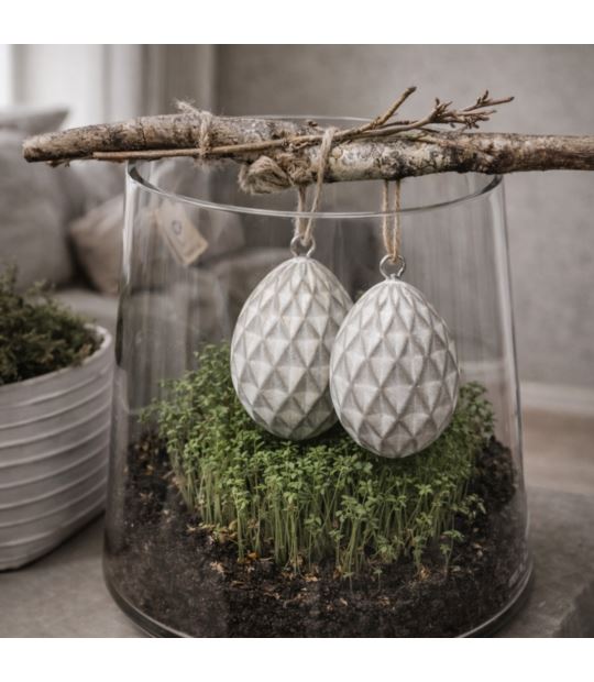 Surowe, ciężkie i wyraziste. To dekoracyjne jajo wykonane jest z betonu, dlatego ma naturalną, lekko porowatą strukturę i chłodny, jasnoszary odcień. Geometryczne tłoczenie pięknie podkreśla światło i nadaje mu nowoczesnego charakteru.