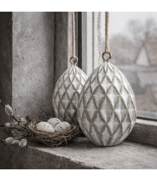 Surowe, ciężkie i wyraziste. To dekoracyjne jajo wykonane jest z betonu, dlatego ma naturalną, lekko porowatą strukturę i chłodny, jasnoszary odcień. Geometryczne tłoczenie pięknie podkreśla światło i nadaje mu nowoczesnego charakteru.