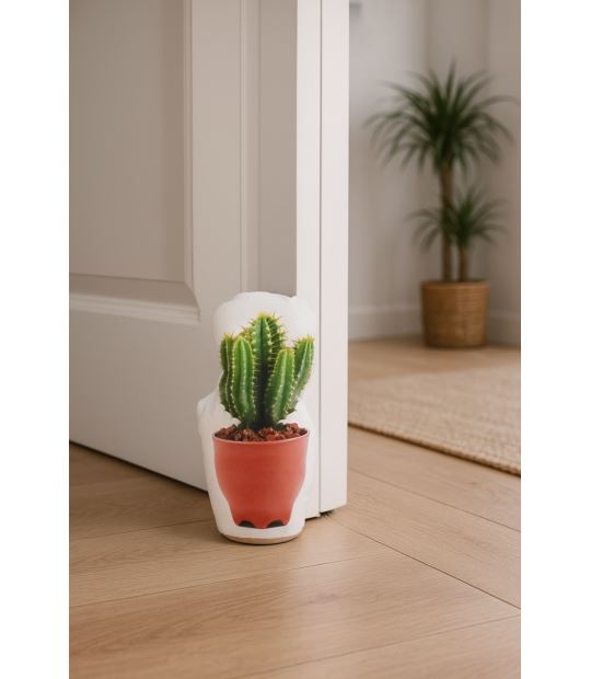 Nietuzinkowa dekoracja w formie stojącej, miękkiej poduszki z realistycznym nadrukiem kaktusa. Wykonana z tkaniny i wypełniona ziarnem, może pełnić zarówno funkcję ozdobną, jak i praktyczną – np. jako stoper do drzwi, zapobiegający ich samoczynnemu zamykaniu.